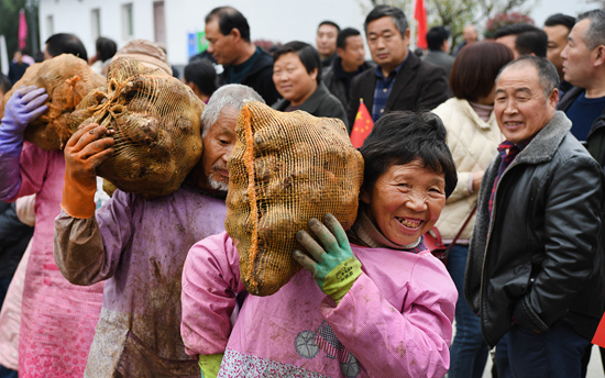 11月12日,岚皋县城关镇东垭村的群众在出售魔芋。近年来,在脱贫攻坚工作中,陕西省安康市岚皋县立足秦巴生物多样性生态功能区和国家南水北调中线工程重要水源涵养区的功能定位,突出育良种、建基地、抓龙头、创品牌等关键环节,全力打造“中国魔芋之乡”,一大批贫困户通过种植魔芋走上致富之路。新华社记者 陶明/摄