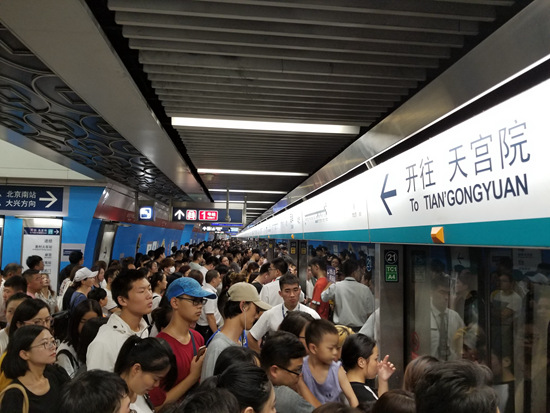 2018年8月6日19时,北京地铁4号线开往天宫院方向由于列车运行缓慢,西单站出现大量乘客滞留现象。