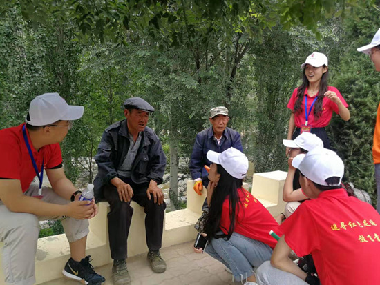 团中央驻灵丘扶贫工作队主办的2019年“追寻放飞青春梦想”全国大学生灵丘暑期社会实践专项活动中,大学生与当地农户进行交流。