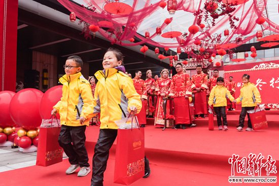 11月28日上午,中建三局城市投资运营公司第二届青年职工集体婚礼在武汉光谷举行。婚礼上,来自武汉市东湖高新区的一所村小——吴泗小学的孩子们为30对新人送上了百福图。作为回礼,中建三局城市投资运营公司以30对新人的名义为全校的孩子们送去了冬季的校服、书包和文具。杜艳丽 中国青年报·中国青年网记者 雷宇/摄