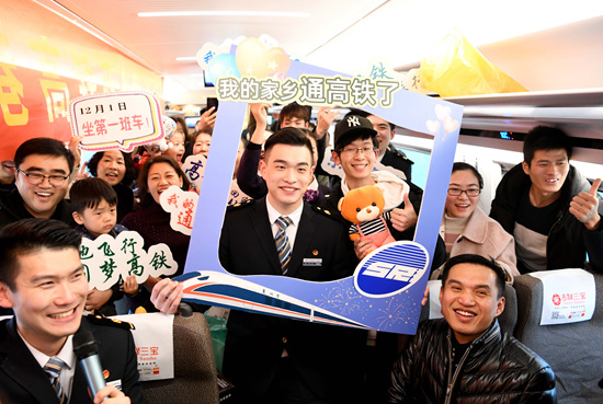 12月1日,合肥客运段工作人员和旅客在阜阳西站开往上海虹桥站的G7787首发列车上合影。当日,京港高铁商丘至合肥段、郑州至阜阳高铁正式开通运营,阜阳、亳州进入高铁时代,安徽省16个省辖市全部实现动车通达。京港高铁商合段、郑阜高铁设计时速350公里,初期高铁列车运行时速为300公里。新华社记者 刘军喜/摄