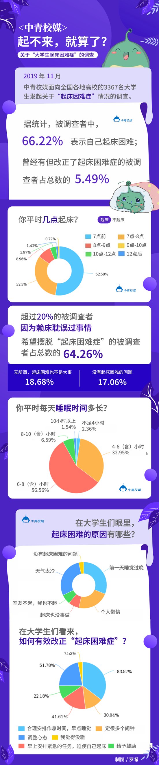 近日,中青校媒面向全国各地高校的3367名大学生发起关于“起床困难症”情况的调查,调查结果显示,62.22%的被调查者表示自己起床困难,32.29%认为自己不存在此类烦恼,5.49%表示自己已经改正了“起床困难症”。