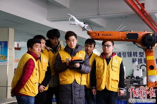 2018年11月21日,山东省邹城市,济宁机器人产业园内,来自山东交通学院的学生在练习机械手臂操作。邹城市是“亚圣”孟子的故里,济宁机器人产业园落户邹城,目前已有北斗天地、智崎科技等6家企业入驻,并连续承办了5届全国大学生、3届全省大学生机器人大赛。中国青年报·中国青年网见习记者 曲俊燕/摄(资料图片)