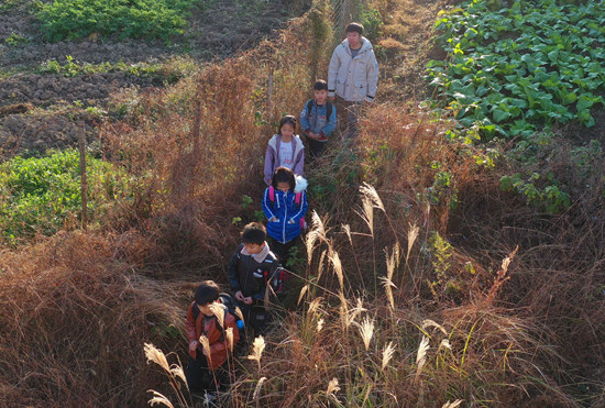 胡茜、伍婵、罗曙、袁丽荷、王德翼、肖哲韬是湖南省南华大学的研究生,今年他们志愿报名,通过审查考核成了研究生支教队的一员。9月新学年开始时,他们带着青春的热情来到了学校对口扶贫点湖南省涟源市古塘乡,开始了他们为期一年的支教之路。11月15日,在湖南省娄底涟源市古塘乡丁家村,南华大学二年级研究生王德翼(后)与同学们一起走在上学的路上。视觉中国供图