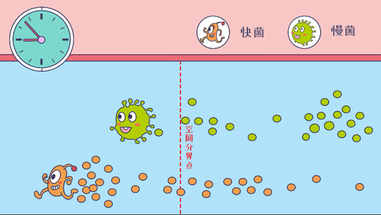 具体来看,两个菌群出发后,菌群数量的空间分布,渐渐地出现一个转折位置,在这里双方“势均力敌”。在该位置以内的空间,“跑得慢”的菌群占有优势,一旦超出这个位置,“跑得快”的菌群则以快取胜。
