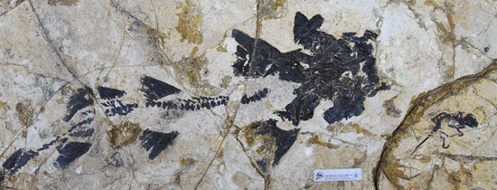 热河俊兽正型标本(右下角)与一件北票鲟标本保存于同一个岩板 王海冰/供图