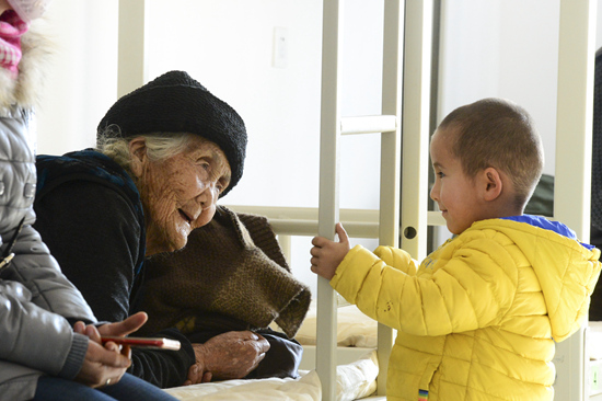 1月20日,在新疆伽师县卧里托格拉克镇第三小学的安置点,受灾群众阿依罕·麦麦提(左)与同住一间安置屋的卡迪尔丁·玉散在休息。