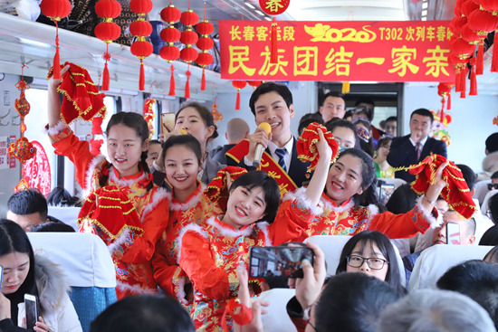 1月22日,中国铁路沈阳局集团有限公司长春客运段工作人员联合长春希望高中学生,在长春至乌鲁木齐T302次列车上举办“民族团结一家亲”列车迎新春联欢活动,为旅客送去新春祝福。