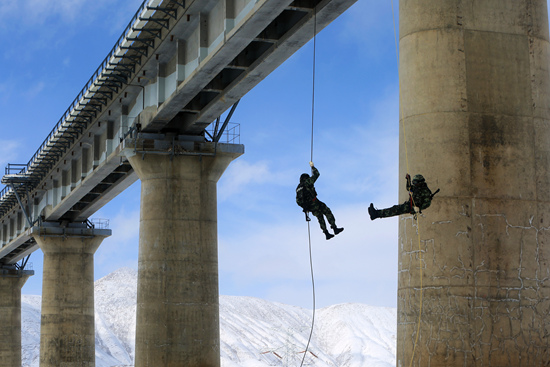 官兵们开展索降训练。
