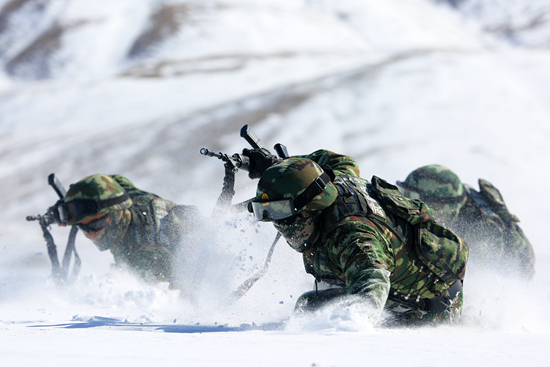 官兵们开展雪地战术训练。