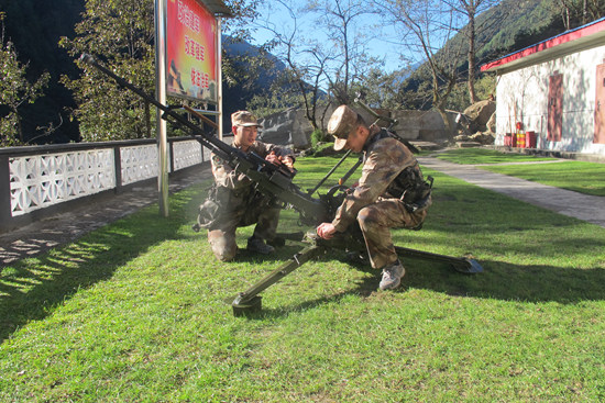 欧阳叶(左)生前与战友进行武器操作训练。王旗红/摄(资料图片)