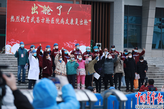 •     2月11日下午,湖北武汉,洪山体育馆武昌方舱医院东门,首批出院的患者与医护人员、工作人员合影。中青报·中青网见习记者 鲁冲/摄