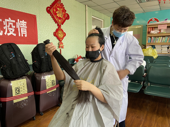 2月9日,天津市和平区妇产科医院手术室护士潘虹在出征武汉前剪去长发。新华社记者 张宇琪/摄