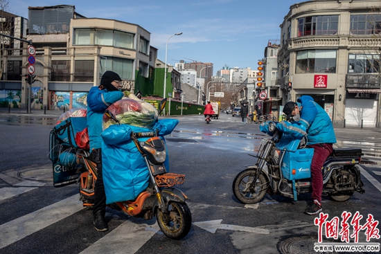 2月16日,湖北省武汉市,江汉路商业街附近,外卖员胡师傅(左)在路口打电话,他接了5单外卖,正在配送。他说,最近活儿很多,今天早上5点多就起床接单了。中青报·中青网记者 李隽辉/摄