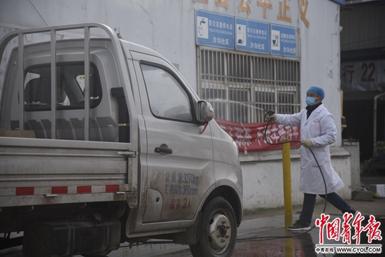 2月17日,湖北省孝感市孝南区沙沟果蔬批发市场,鲁师傅在为刚进来的车辆消毒。为保证食品安全,所有车辆进入后会立刻到消毒区进行消毒。中青报·中青网见习记者 鲁冲/摄