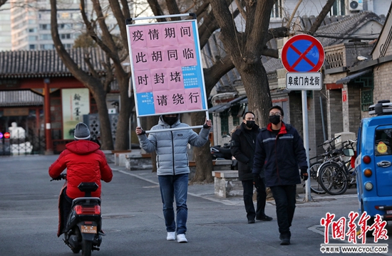 2月17日,北京西城区阜成门内大街的社区工作者在胡同里进行疫情防控。近日各企事业单位陆续开工,北京迎来返京高峰,疫情防控进入关键时期。 中青报·中青网记者 李建泉/摄