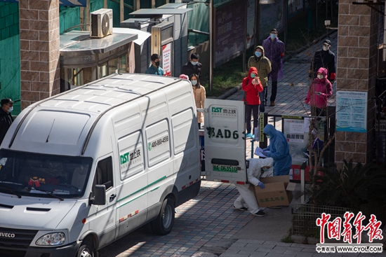 2月17日,武汉市武昌区一小区门前,社区帮助居民采购的蔬菜、鸡蛋等物资抵达。居民间隔1米排队,等待取货。中青报·中青网记者 李隽辉/摄