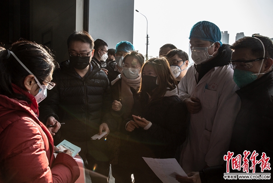 1月31日,武汉国际博览中心,医务工作者们向一名武汉市卫健委的工作人员递上各个机构开具的介绍信,希望能领取物资。中青报·中青网记者 李峥苨/摄