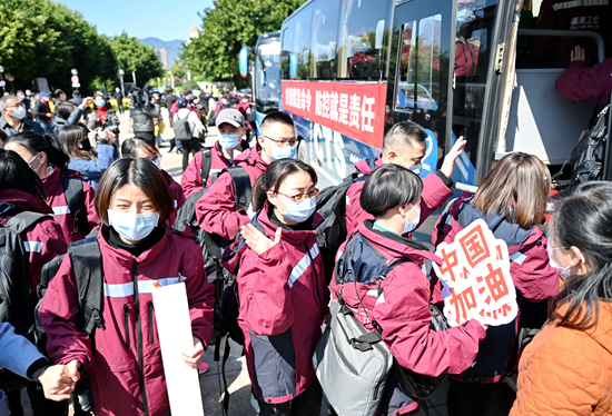 2月18日,福建省第二批对口支援宜昌抗击新冠肺炎疫情医疗队员登车出发。截至2月18日,福建省已派出1206名医务人员支援湖北打击新冠肺炎疫情。新华社记者 林善传/摄