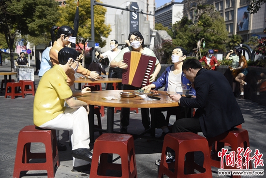 2月16日中午,武汉市江岸区的美食街吉庆街上,一组群雕被人挂上了口罩,一位市民坐在旁边吃午餐。中青报·中青网见习记者 鲁冲/摄