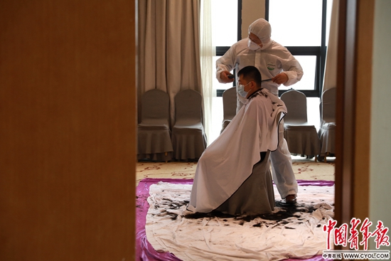 2月24日,湖北省武汉市武昌区,志愿者张宇枫在雄楚大道一家酒店的24层为一名工作人员理发。当天是农历二月初二,不少地方都有理发的习俗。在为30多位医护人员服务后,张宇枫又为运输物资的司机、酒店保安和住在酒店里的记者等一线工作人员理发。