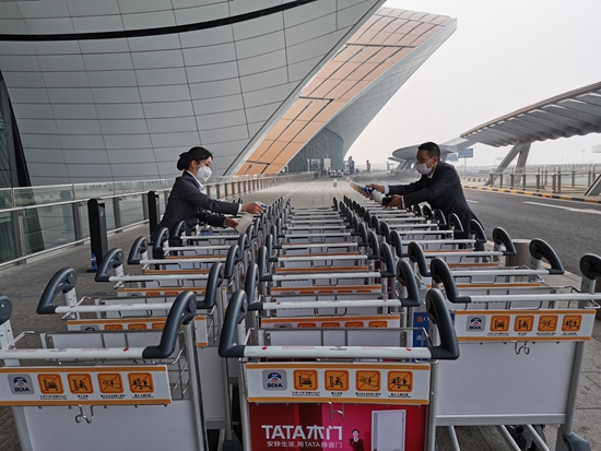 在北京大兴国际机场内,工作人员正在对行李车进行消毒杀菌处理。在全力支撑“空中物资供应线”的同时,各大航空公司和各地机场增加并升级了多项抗击疫情措施,不给疫情防控工作留死角。李慎波/摄