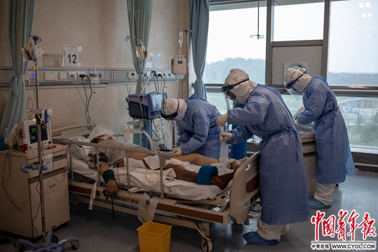 2月26日,湖北省武汉市华中科技大学同济医院光谷院区,由该院血液净化中心护士长鄢建军(右)带队的“护肾小队”在园区ICU病房中,为一名新冠肺炎病人做血液透析前的准备。该院所收治的新冠肺炎病人均为重症或危重症患者,当日,他们为10名病人进行了血液透析操作。中青报·中青网记者 李隽辉/摄