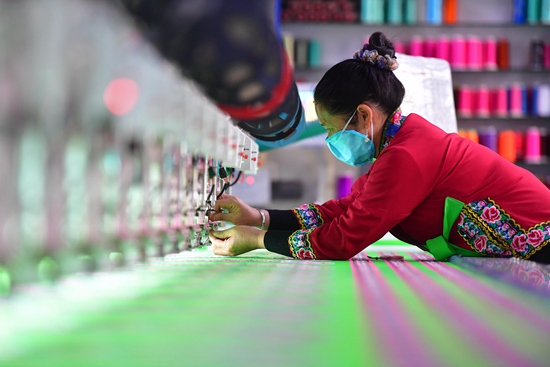 2月27日,在广西融水苗族自治县一家刺绣生产企业,工人在车间里作业。近日,广西融水苗族自治县60多家巾帼脱贫示范基地在做好疫情防控的同时,积极复工复产,让贫困妇女通过就业增收。新华社记者 黄孝邦/摄