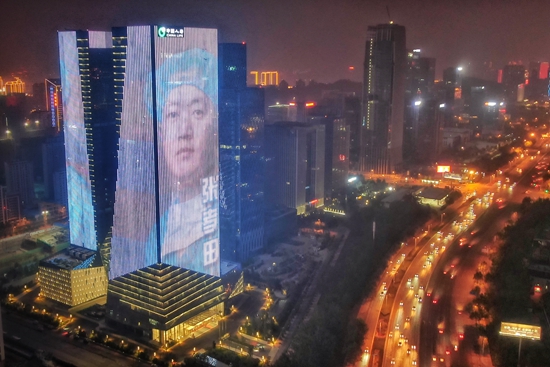5月3日,济南市经十东路的繁华商业街,多名获得第24届“中国青年五四奖章”的战“疫”青年肖像登上中国人寿大厦“城市之窗”楼体大屏幕。当日,中国青年报社携手“城市之窗”,在国内6座城市进行楼体大屏幕展示,致敬战“疫”青年。上海外滩之窗、北京通盈、济南新中心、合肥文峰中心、西安陕西信息大厦、哈尔滨567漫天地购物中心等城市地标建筑陆续点亮楼体大屏幕,播放获得第24届“中国青年五四奖章”的战“疫”青年代表的肖像。王鑫/摄