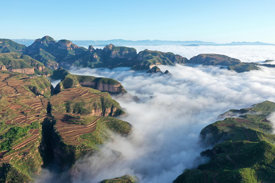 这是5月5日在河北省沙河市刘石岗乡渐凹村拍摄的云海景观(无人机照片)。5月5日,雨后的河北省沙河市刘石岗乡渐凹村云雾飘渺,村庄、山峦、梯田在云海中若隐若现,构成一幅美丽画卷。 新华社记者 牟宇/摄
