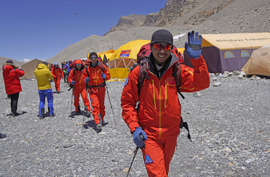 5月6日,登山队员离开珠峰大本营,向更高海拔进发。当日,2020珠峰高程测量登山队伍在珠峰大本营举行出发仪式。30多名队员从海拔5200米的大本营向更高海拔出发,开启珠峰冲顶测量。如果成功,这将是我国专业测绘人员首次登顶珠峰测高。新华社记者 普布扎西/摄