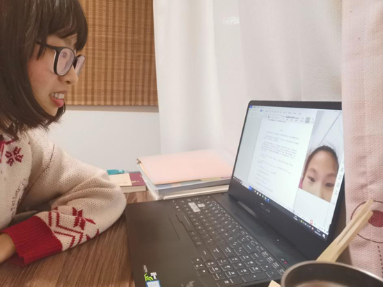 志愿者郑淑艳辅导一位一年级的小女生。郑淑艳一度非常紧张,正式上课后,共享屏幕中小朋友可爱的笑脸一下子就驱散了她前期的不安,小朋友的积极配合也使她深受感动。