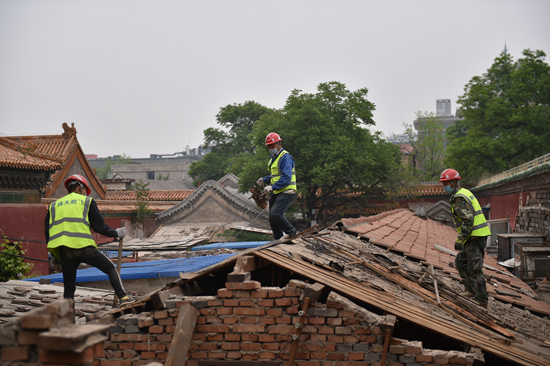 5月7日,工人在皇史宬南院内的屋顶上拆违。5月6日,位于北京市东城区南池子大街皇史宬南院内近600平方米的违建开始被拆除,拆除后,皇史宬整体古建风貌将被恢复。皇史宬始建于明朝嘉靖年间,为明清时期的皇家档案库,由于历史原因,其南院成为了居民居住的大杂院。陈钟昊/摄(新华社发)