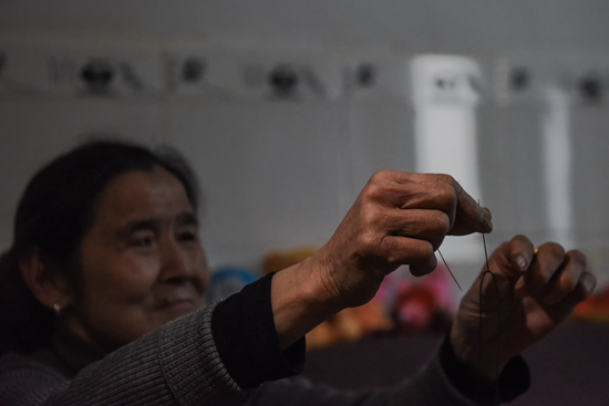 全聋全盲的68岁老人官爵容能熟练地穿针引线,多次实验无一失手,图为她骄傲地展示自己穿线成功。曾浙峰/摄