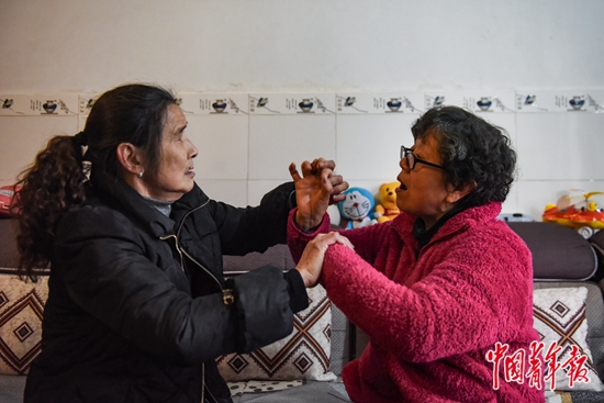 官爵容与重庆市北碚区聋协前主席颜淑媛用触摸式手语沟通,讲述自己的身世。中青报·中青网记者 田文生/摄