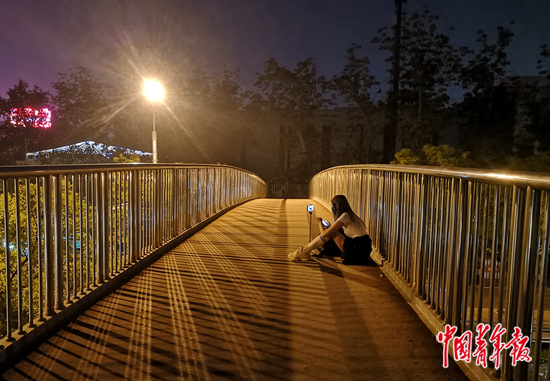 4月29日,北京工人体育场附近的过街天桥,一位女青年正在进行网络直播。中青报·中青网记者 陈剑/摄