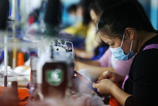 5月16日,重庆,黔江区城南街道李家溪易地扶贫搬迁安置点服装加工厂,搬迁户在加工服装。人民视觉供图