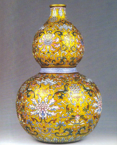 (清)乾隆金地粉彩缠枝纹葫芦瓶。
