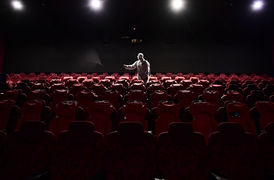 3月25日,在辽宁沈阳比高电影院,工作人员在消毒。张文魁/人民视觉供图