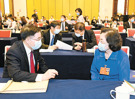 5月22日,全国政协十三届三次会议民革、台盟、台联界委员联组会间隙,傅惠民委员(左)和田惠光委员就政府工作报告交换意见。人民政协报·人民政协网记者 姜贵东/摄