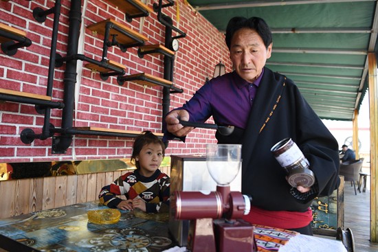 6月20日,在甘南藏族自治州碌曲县尕海镇尕秀村,村民格日扎西(右)在自家的牧家乐里调试新买的咖啡机。
