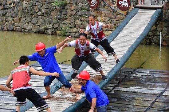 在广西融水双龙沟森林旅游度假区梦呜苗寨,几位搬迁户协助游客挑战“摇摆桥”。近年来,融水打造原生态苗族文化体验园——梦呜苗寨,让搬迁进城的贫困户住进复原建设的老房子。景区提供绿化保洁、游乐设施管理、民族歌舞表演等工作岗位,多渠道增加贫困户收入。