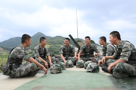 谭斌(左三)和战友们聊天谈心。余浩宇/摄