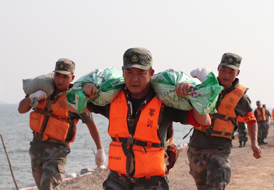 谭斌(中)参加抗洪抢险任务。毛宏伟/摄