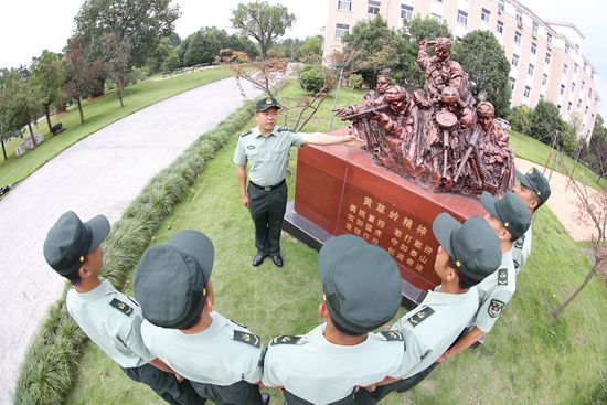 谭斌在“黄草岭英雄连”雕塑前为战士们讲述英雄故事。杨洺泷/摄