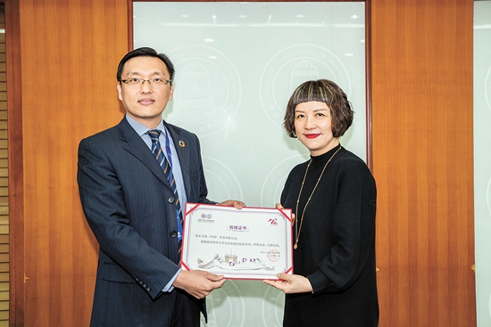 朱旭峰教授(左)向王珏女士(右)授予捐赠证书