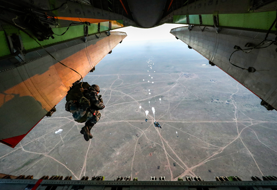 “上甘岭特功八连”官兵开展跳伞训练。方超/摄