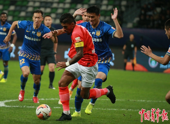 11月8日,江苏苏州奥林匹克体育中心,恒大队头号主力、外援保利尼奥(红衣)带球杀入禁区 。当日,2020中超联赛决赛首回合比赛开打,江苏苏宁易购队和广州恒大淘宝队过五关斩六将后会师决赛。最终,两队以0∶0战平。双方将于11月12日在同一场地进行第二回合的比赛,决定2020这个特殊赛季的冠军归属。