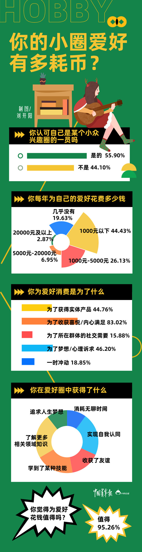 中青校媒调查显示,83.02%被调查者会因收获喜悦和内心满足,为自己的兴趣爱好消费,可以实现梦想与心理诉求(46.20%)、能够满足所在群体的社交需要(15.88%)及可以获得实体产品(44.76%),亦代表了Z世代对于圈层文化消费的认可。值得一提的是,95.26%受访大学生认为为小众爱好花钱是值得的。