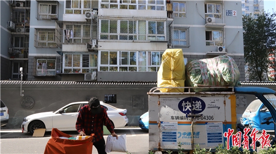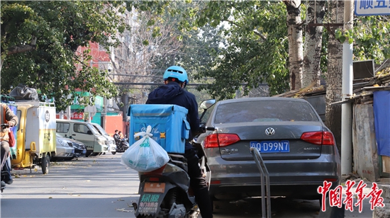 11月12日,一位快递小哥正在整理上午需要配送的快递,在他11日配送的快递中,一少半是塑料包装。中青报·中青网见习记者 赵丽梅/摄